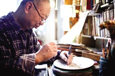 茅子芳正在家中刻瓷。作为这项北京市级非物质文化遗产项目的代表性传承人,他从事刻瓷艺术已经50年时间。而今,这项技艺正面临着后继乏人的窘境。